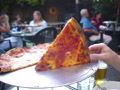 トッピングも、シカゴ・ピザみたい盛りだくさんではなく、とてもシンプル。わたしたちがオーダーしたのは、プレーン・ピザ(チーズ・ピザ)だったので、なおさらシンプル。この少なめのトッピングということにもこだわっているらしく、ピザの種類は少なめです。トマトソースも、感動的な美味しさがある。良くあるパターンとして、ハーブ類を非常にたくさんいれて、おまけに塩分もかなり高めで、トマトの味はどこにするんですかぁ〜という場合が多いけれど、ここは違った。最初に口の中に広がるのは、トマトの甘味。これはもちろんお砂糖の甘味じゃない。その後にくる、ハーブの香りはたぶん2種類くらいだったと思う。これも見習うべきことのような気がしました。あれこれ入れればいいってものじゃないと、改めて気がつきました。